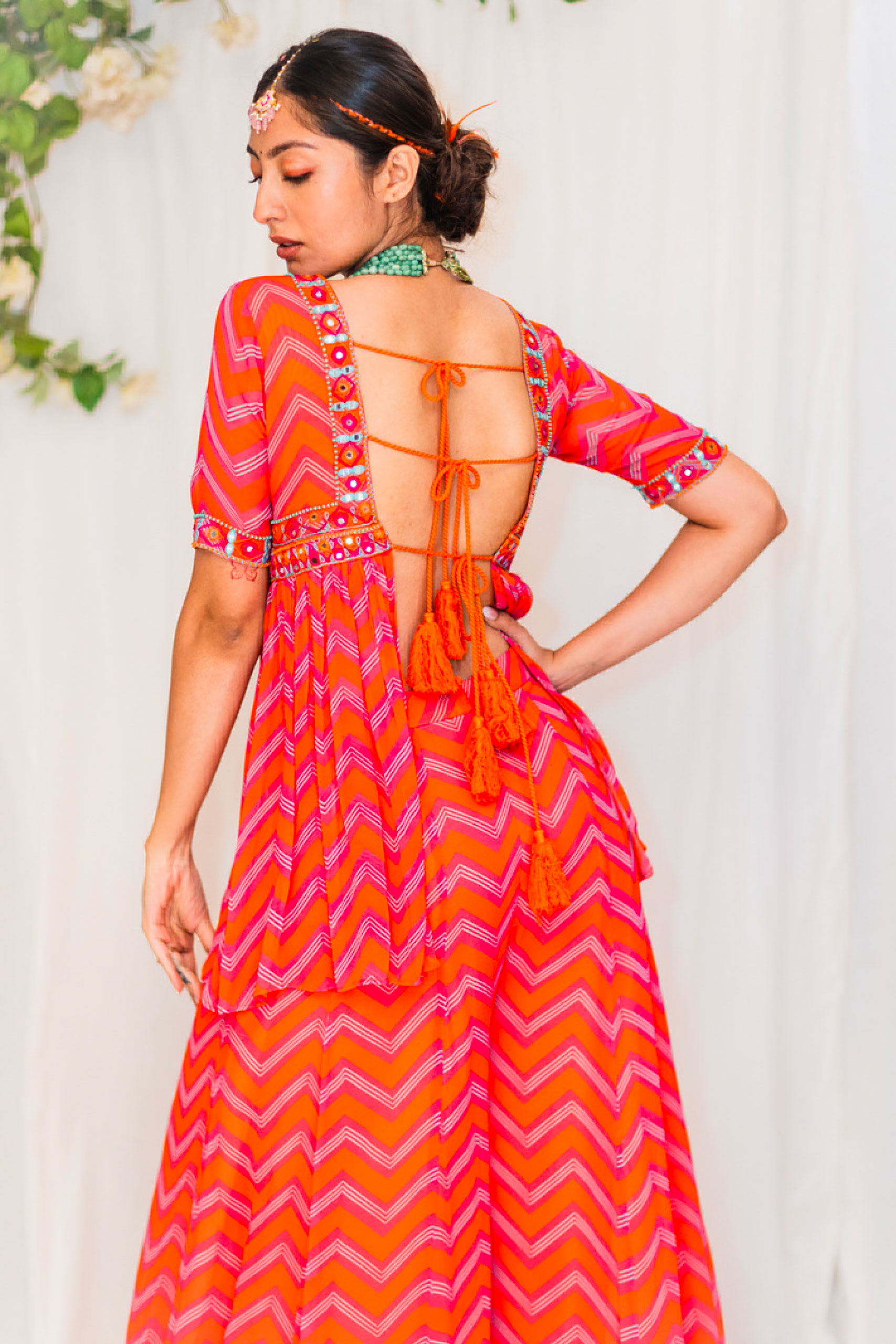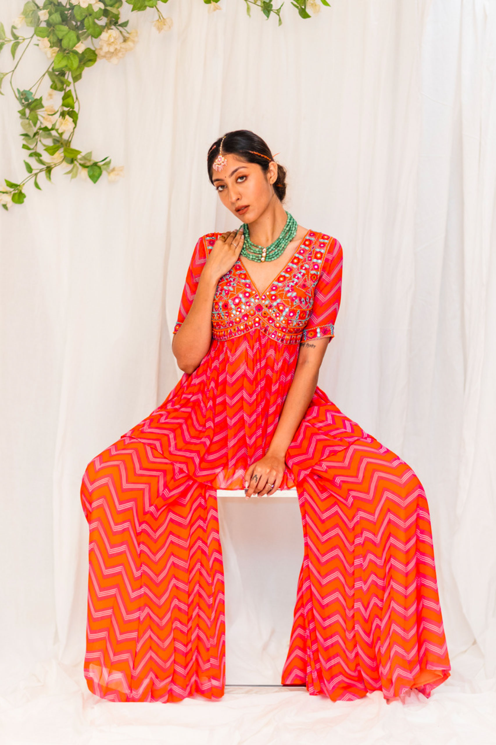 Coral Chevron Georgette palazzo set with mirror work embroidery & tassels