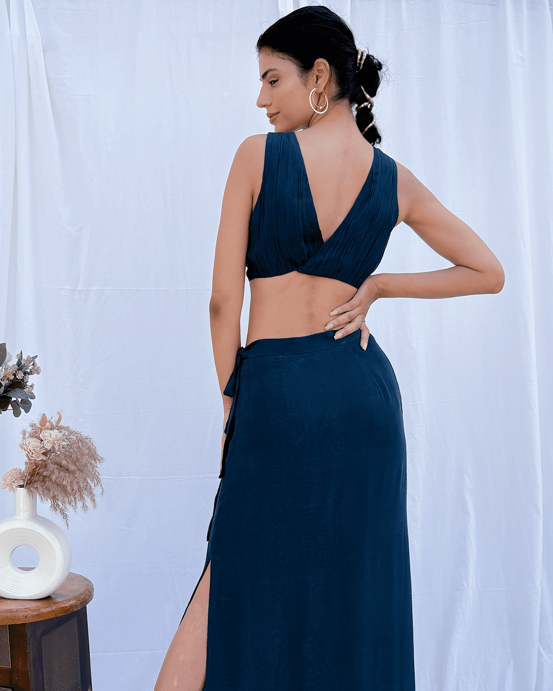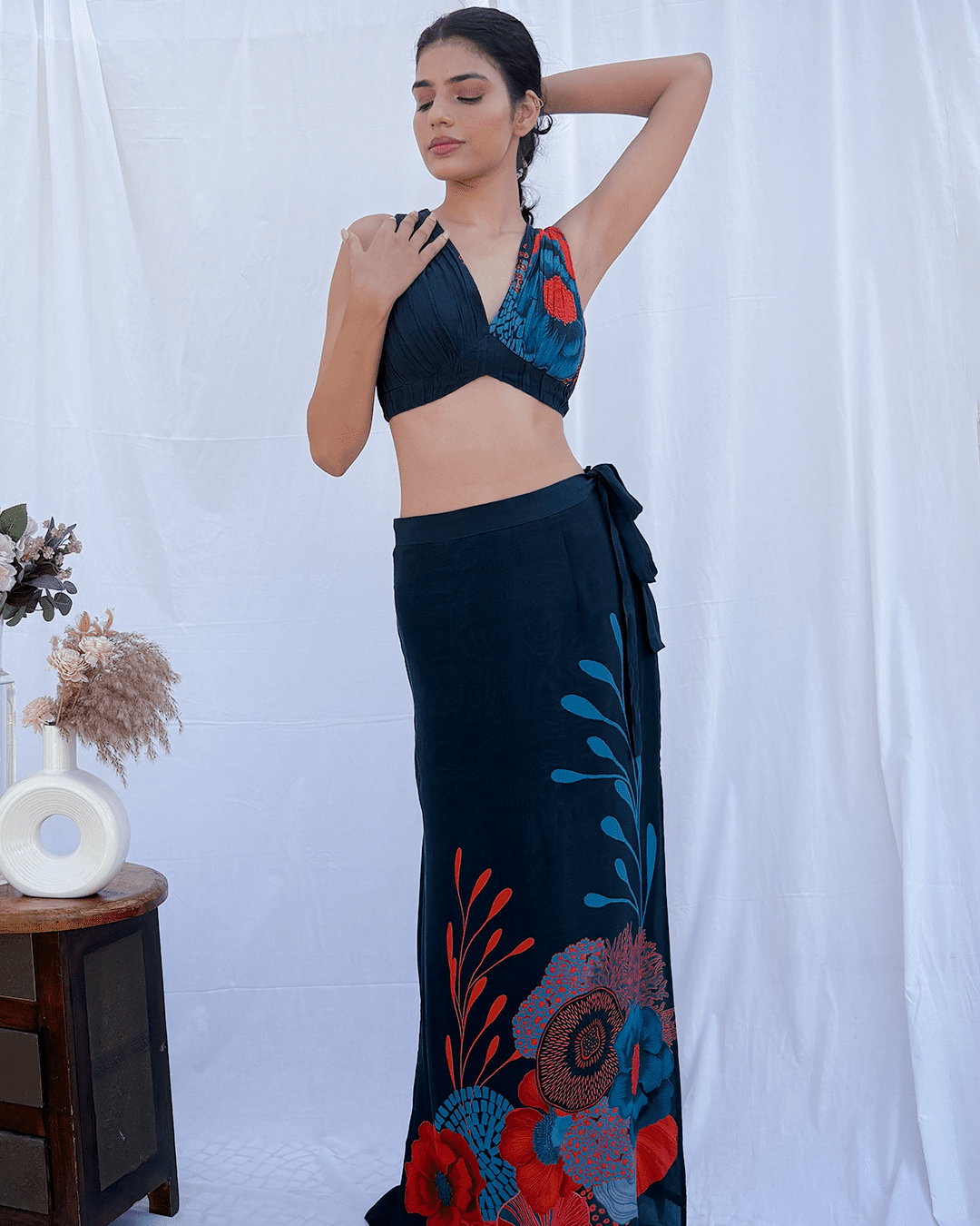 Draped printed choli with straight skirt with slits on the side