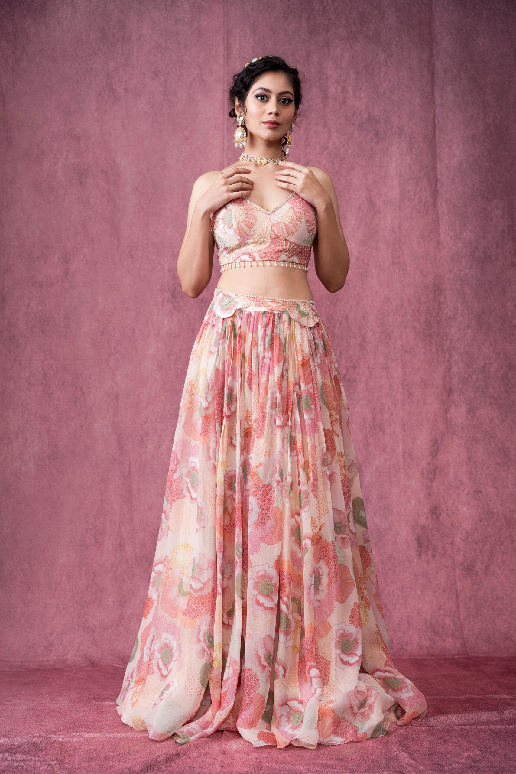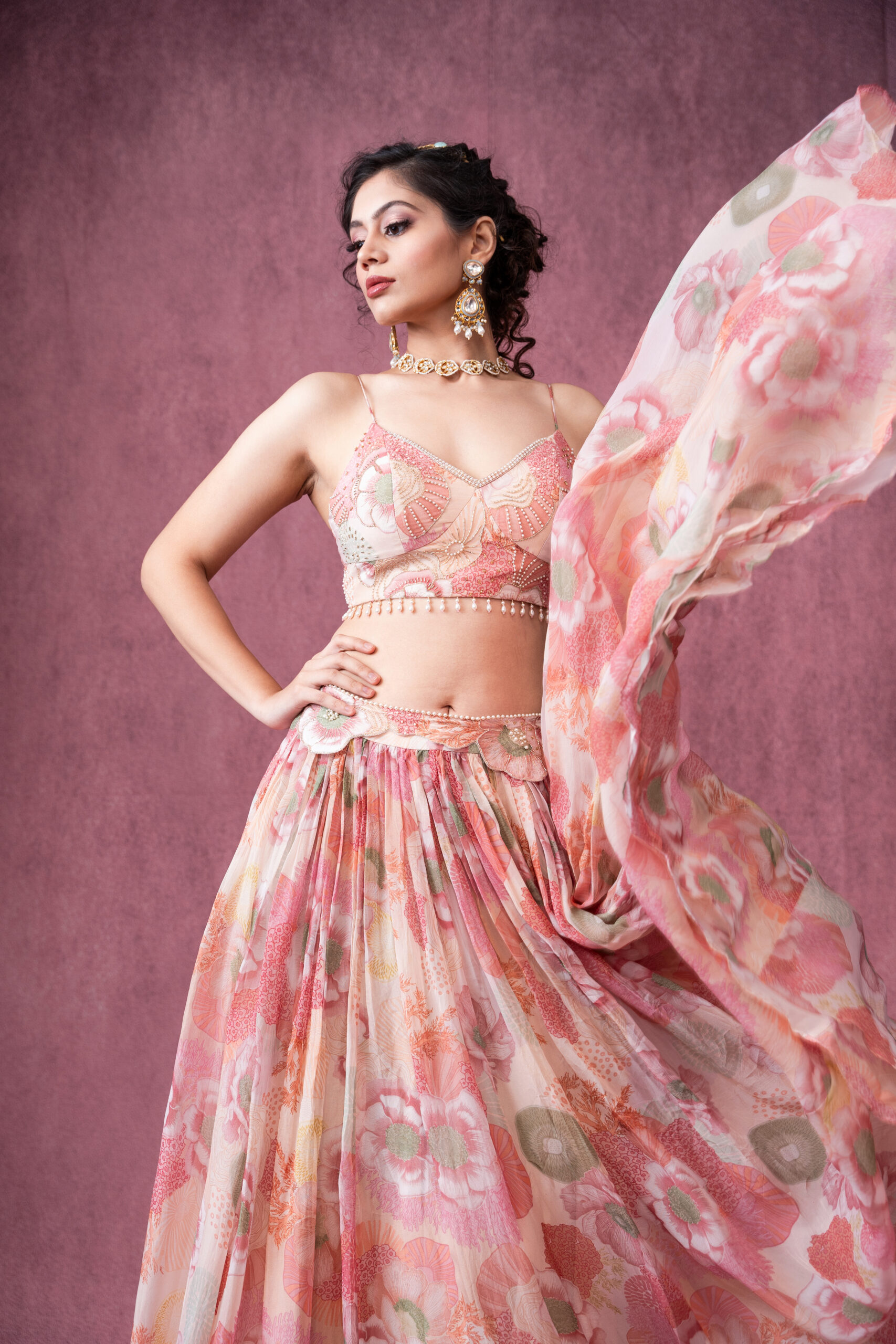 Ivory and pink floral printed organza lehenga set with embroidered choli
