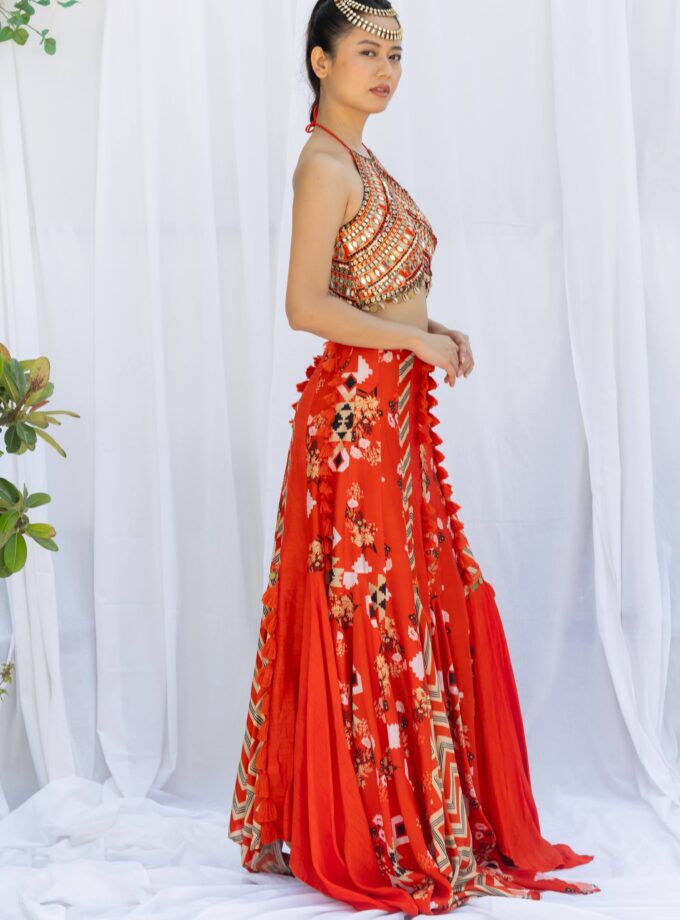 Ivory and pink floral printed organza lehenga set with embroidered choli