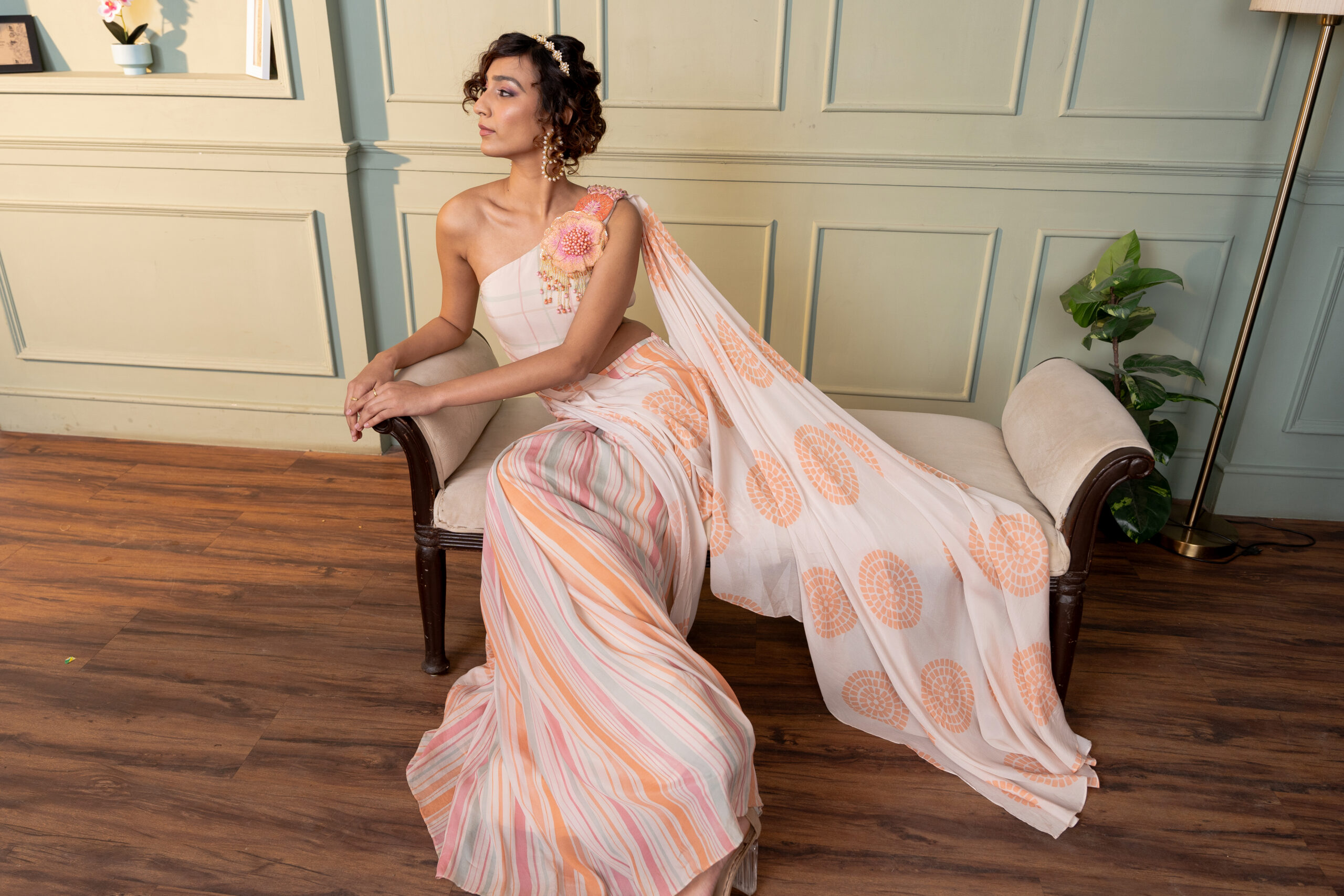 Ivory one shoulder drape saree with hand embroidered motif