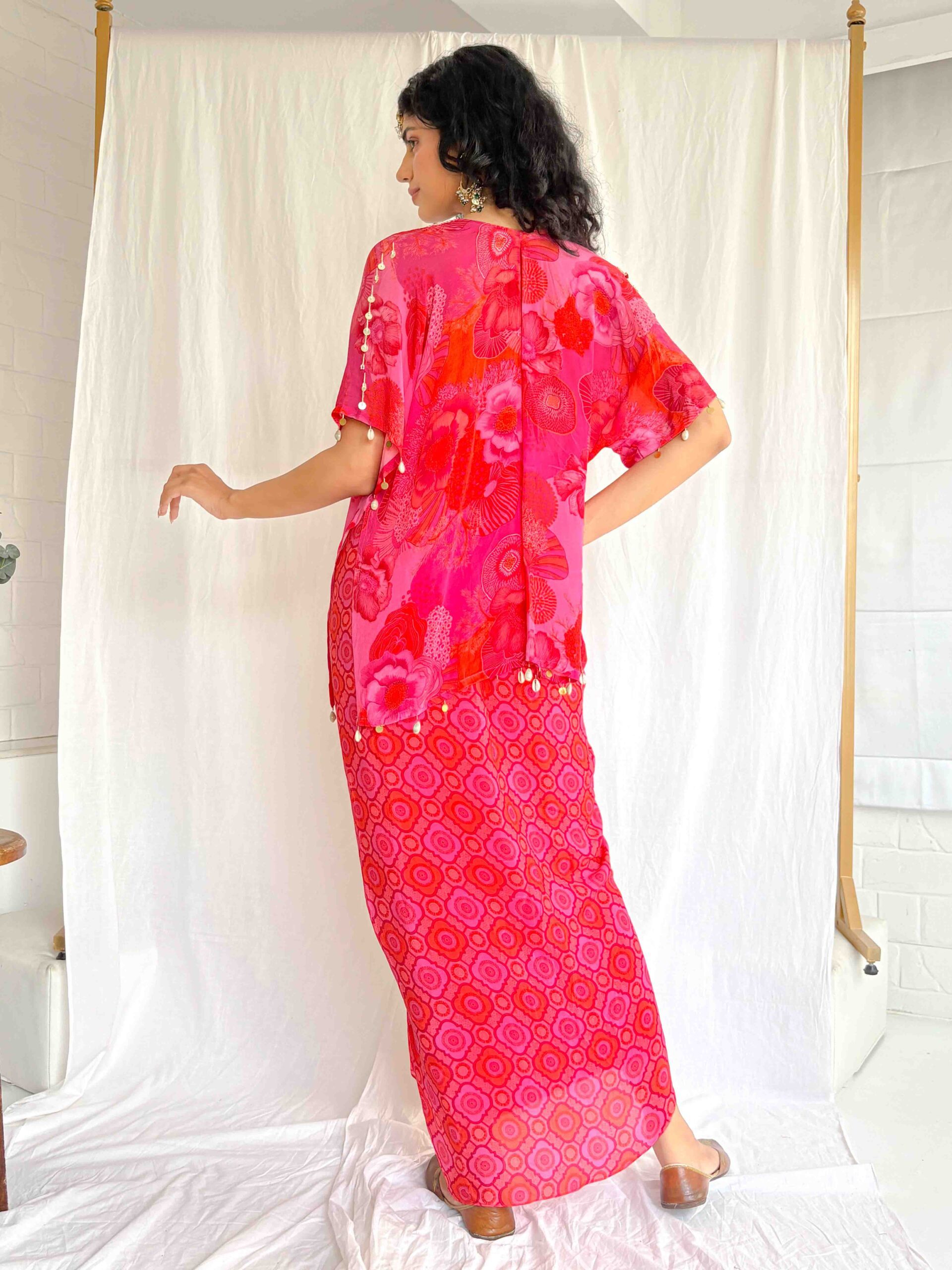 Pink silk printed embroidered kaftan with a draped skirt