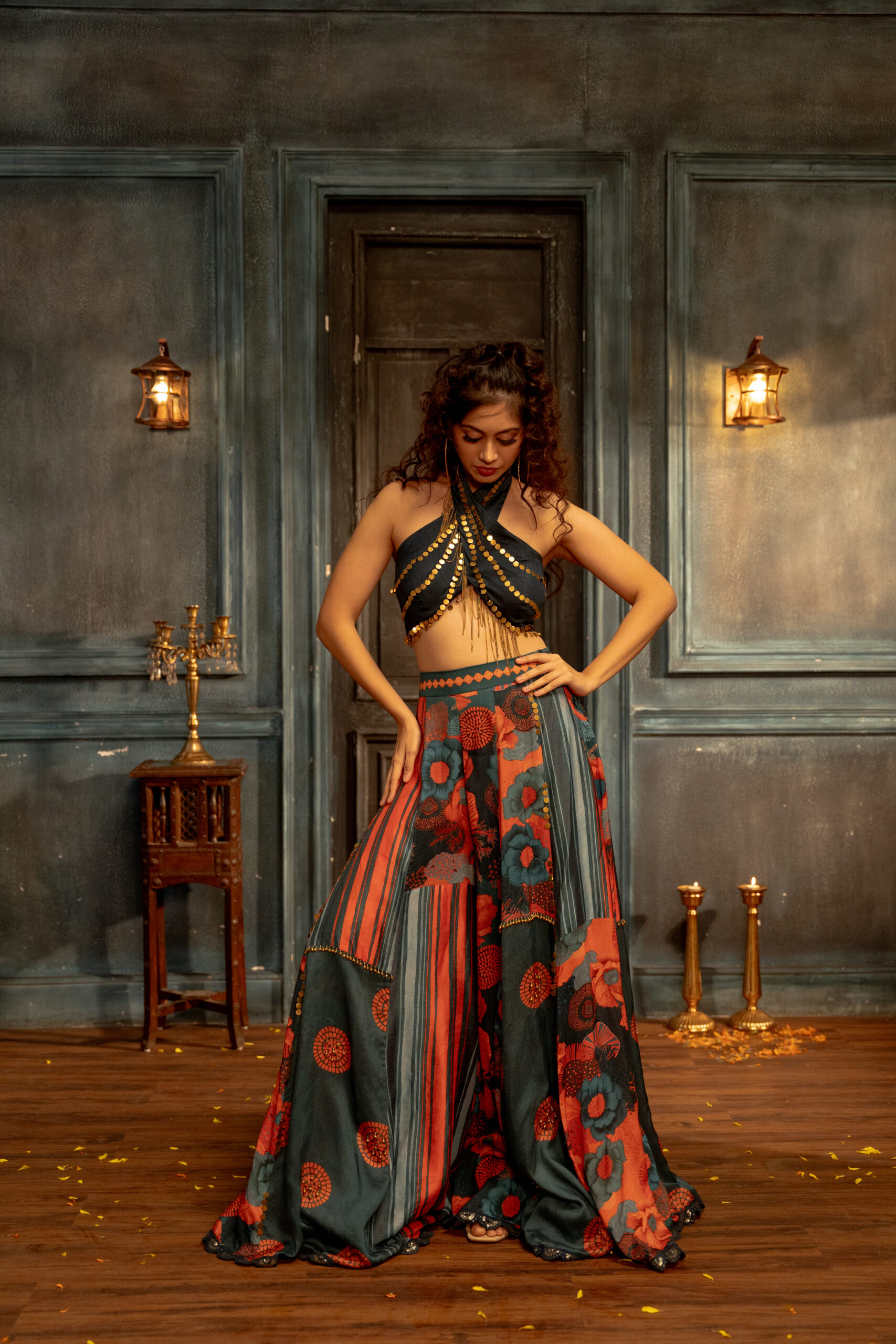 Teal patchwork palazzo set with draped choli