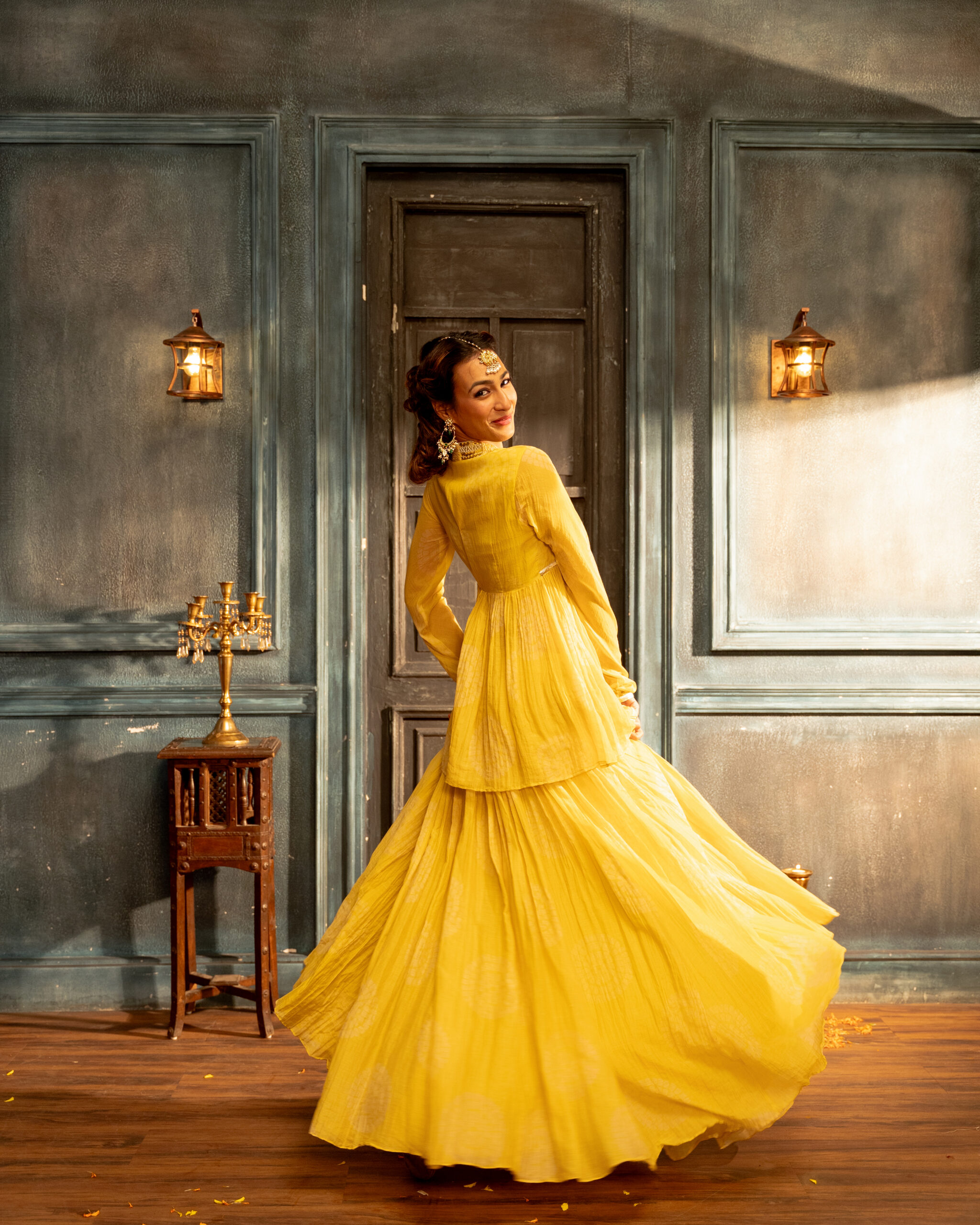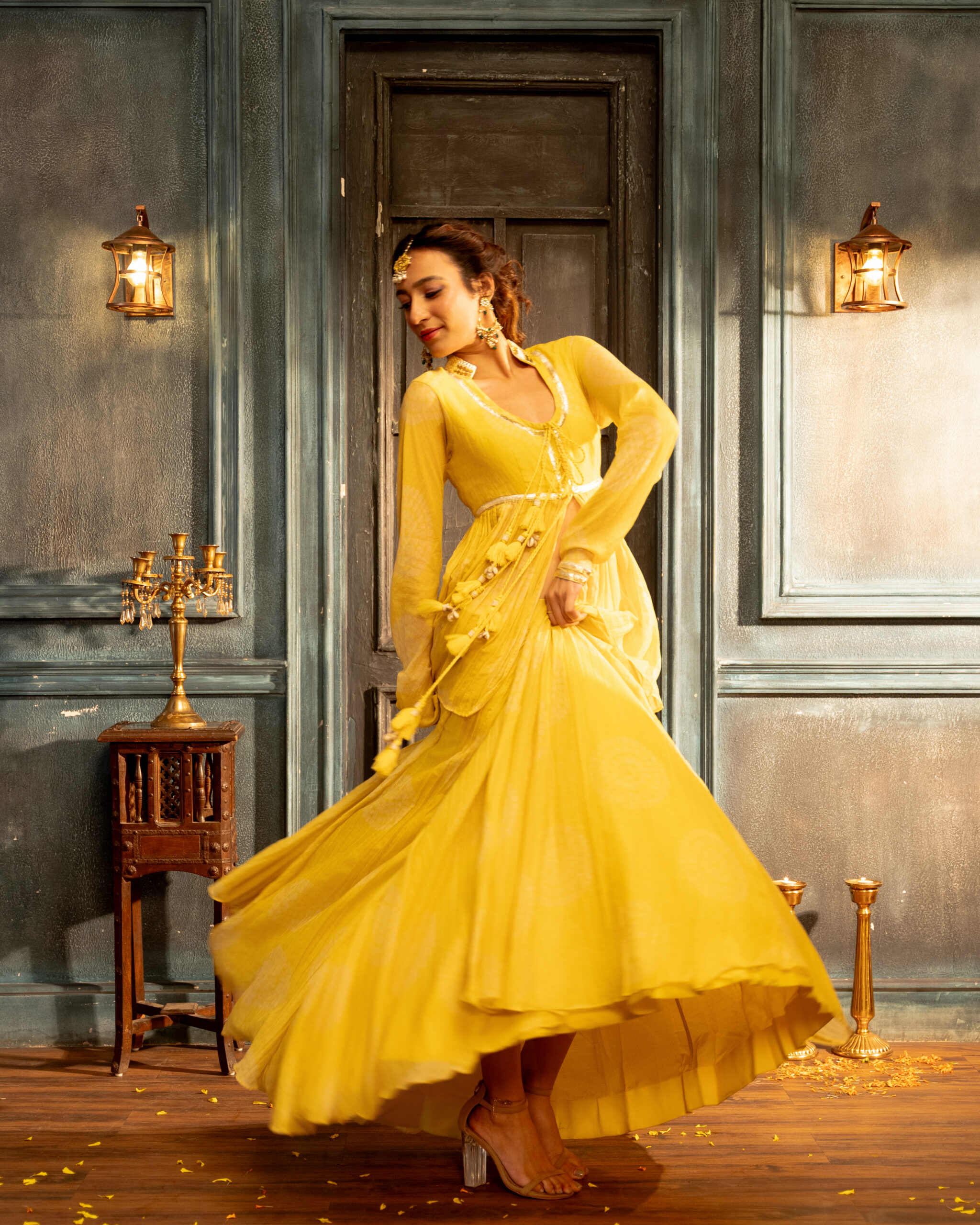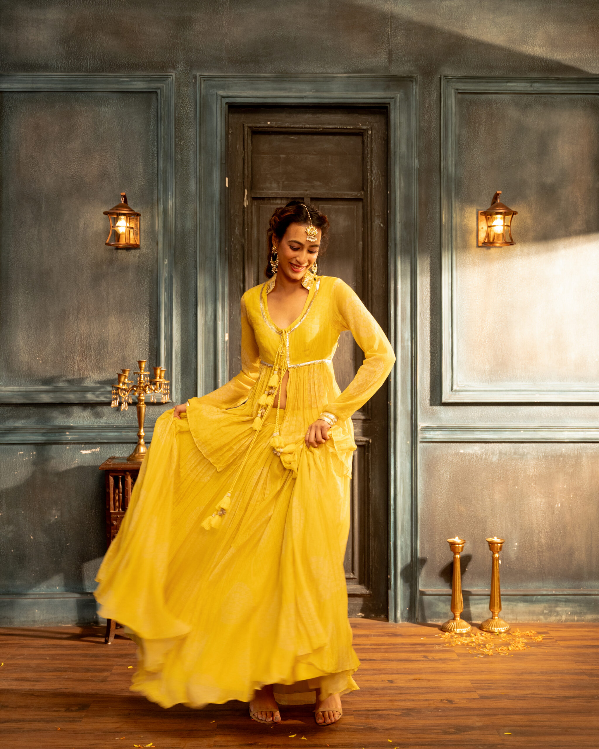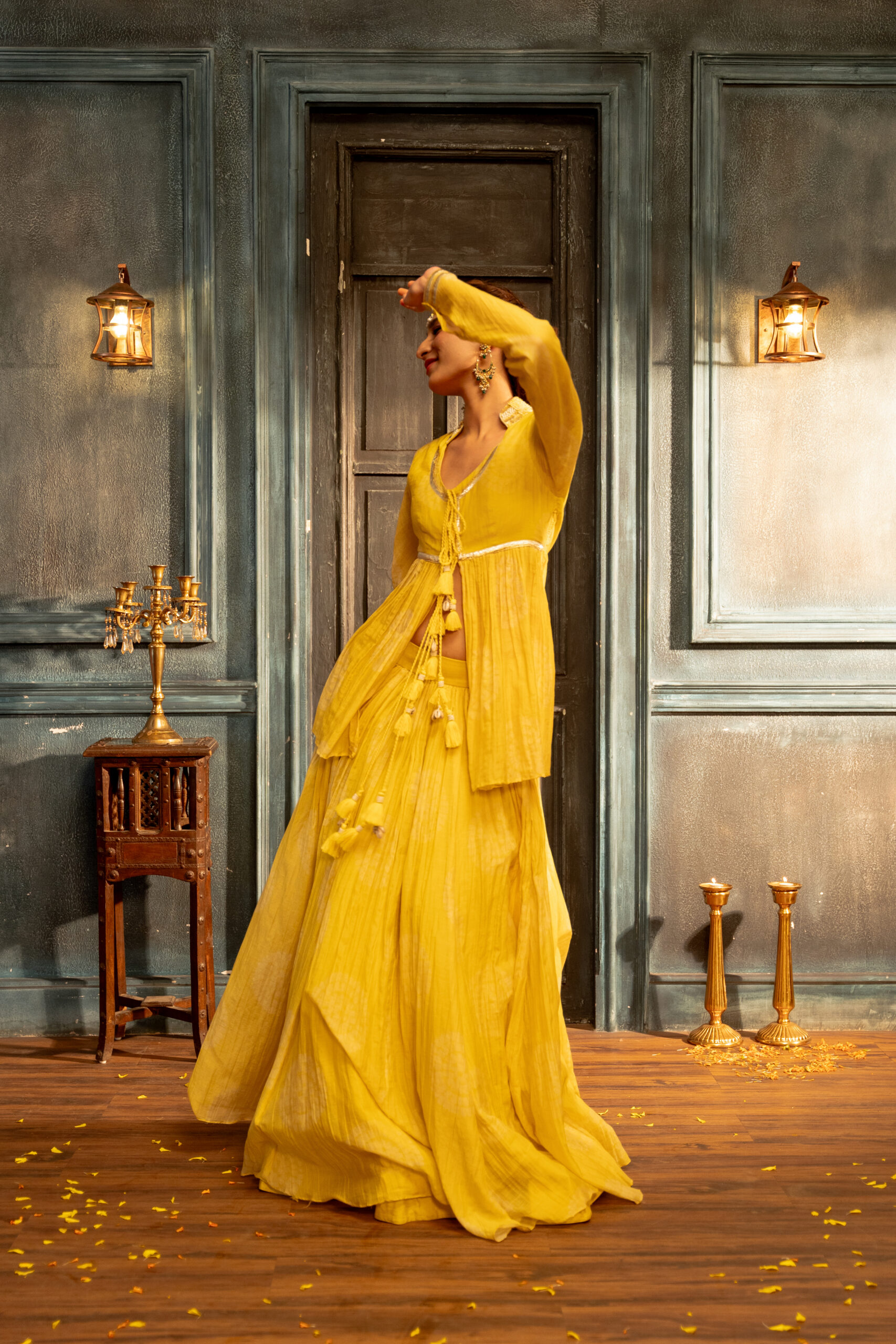 Yellow polka printed chanderi lehenga with kedia kurta